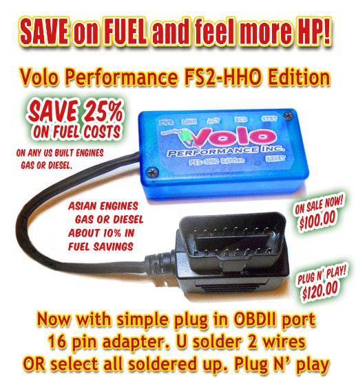 I do have an HHO generator, a pretty decent one too, up to 3LPM. When it was producing about .5LPM, my mileage went up about 5% and ran great. I jumped it up to 1LPM and this I broke mileage records (31City/48Highway), but this lasted for only 1 trip. I have brought it up to 3LPM and DESTROYED my gas mileage, no more then 15MPG city or highway, so poor I had shut off the HHO. I do use a Scanguage so I can tell how the engine is behaving very quickly. The Volo definitely has it's limit's and don't know what it is, but it's not very high. I believe an EFIE in conjunction with this Volo is the way to go, but need to prove that. The EFIE will ball-park your HHO settings, then the Volo can "Tweak" that to optimum level's. Just the Volo is not good enough :( I believe this limitation is more on the ECU then the Volo, as it's programmed to keep mileage low.. Wish Carb's would come back out! I find it pretty pitiful that on all the old Carb-based vehicles, there is a little dial to change the fuel/air ratio, now, we have to buy additional hardware (EFIE) to get that same little dial. The only advantage, you can run the electrical wires to the cabin so you can adjust it while your driving down the highway. I will add more later when I know more.. Lincoln Navigator 2000 , 24% with volo and 50% and 53% better MPG test with hho booster. Last mileage check it went to 25% better MPG. Why did it go down? ? ---- Honda Civic 2005 After installed the Volo FS2-HHO and follow all the instruction and setting into my Honda Civic, this chip did nothing at all and did not improved either my mileage or performance, same to the HHO installed into my 2005 EX. I do not know what exactly is going on with the car computer chip set, it seems like the staff you sent over does not work and don't overwrite the car system. I am very disappointed after spending so much money, gaining 0 mpg increase. Total waste. ( I try to help people above who get no gains, you can usually trouble shoot what they did wrong. Many factors come into play to see gains ) Did you sell more chips for this same make and model? If so, were their results better than the ones I'm getting? If so, please send back some information regarding my situation. Toyota Tacoma 2005 4 cylinder I was using a Mason Jar unit for about a thousand miles before it quit. So I removed it but continued to use the Volo chip without hydrogen. The gas mileage is still around 25 mpg even on these windy mountain roads. I use regular ethanol and synthetic oil. ------- Chevy Suburban The Suburban experienced a 4 mpg increase%, for about one week.Now it's back to its original mileage. The hho generator increased the mileage from 8.5 to 14 mpg. The owner is happy with that so I just left the Volo sitting there blinking happily. I like the concept of Volo but am afraid to order more. I have six rigs waiting for an hho package. They have to work right from the git-go so your guarantee is worthless to me. A failed installation hurts everyone in the industry. Perhaps you could get the inventors out of the cave they seem to be hiding in and get some help. I would be happy to order the product from you when you can assure me it works every time and all the time. --- Ford Freestar 2005 , 3.9L engine. I installed a HHO generator from Mileage Shop, also called Alternative Fuel, 5 months ago. The gas mileage didn't change at all. Afterwards I purchased a FS2 unit from you and I purchased a pig tail to plug into the van. I connected the FS2 to the pig tail, so I can plug in and unplug this unit, from the vehicle. The first unit didn't do anything. When you sent me the second unit, my mileage went from 15mpg in town to 18.9mpg and highway from 19mpg to 24mpg and the lack of power at 1/2 throttle, from take off to 2,000 rpm is gone now. I took many trips with just the FS2 unit on, now my mileage has improved to 27mpg, just driving 5mph over the speed limit, same as I always drive. ------ Hyundai Tucson 2006 I worked with the Volo FS2-HHO since April both with and without the HO booster turned on. Having conducted over twenty trials I have been unable increase my mileage and in one interesting trial I actually lowered my mileage by 1 MPG. In each trial I traveled between 250 and 400 miles before making another attempt. It now sits unused in my Hyundai. (in this case send back for a refund, or burn it for another car. Just send it back.) Dodge Magnum 2008 2.7 Liter V-6 I have since installed a HHO Generator in my Dodge Magnum. I have a Volo FS-2 HHO Edition Chip and the results are pretty good. Original MPG ALL AROUND DRIVING 17 TO 18 MPG, Now 21 to 22 MPG. Freeway was 20 Mpg now 26 to 28 Mpg This Friday we will take the Ion on a 600 mlie trip. it is also equipped cell unit and a Volo FS-2 HHO Edition Chip. I an expecting good results and will write you with the results. . Holden Commodore 2007, 3.8 Liter I installed my system on my 2007 Commodore and have achieved fuel economy improvement from 13.5 L/100km to 6.1 L/100km. ---- For your information, Every of Volo Chip especially FS2 which we burn are working fine on all Asian Made cars. ------ Toyota Tocoma (year?) the volo fuel saver has not made a difference in mileage, but it has in performance the acceleration is more responsive ---------- Chevy Colorado 2010 Installed Volo chip and B3 cell. Running B3 at 18 amps, bubbles like hell. Reset the Volo chip several times. Gas mileage on a 3 tank average was 19.2mpg is now 16.1mpg. So far have a 3 mpg loss. ----- ----- I used a pwm and a 9 plate dry cell on my 2000 ford f150 5.4 liter gas engine w/ volo2hho. no improvement after many tankfulls and volo resets. turned off the pwm and drycell, reset the volo and got a 1.5 mpg increase ------ --------- ----- Dodge Hemi 4x4 Truck 2005 Dear hydrogen Garage, Thanks for providing me with such a wealth of knowledge and quality products. I have a quick technical question for you. I just completed a full installation on my 2005 Dodge Hemi 4x4. Due to some